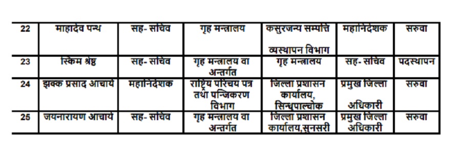 हालै विभिन्न मन्त्रालयबाट गृहमा पुगेर अतिरिक्त समूहका रहेका सहसचिवहरुसहित २५ सहसचिवहरुको सरुवा गरेको हो।
