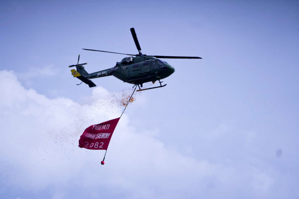 समारोहमा सैनिक परेड प्रदर्शन, दुर्गा नाचका साथै सेनाको हेलिकप्टरबाट ‘फूलपाती बढाइँ समारोह–२०८२’ व्यानर प्रदर्शन र पुष्पवृष्टि गरिएको थियो।