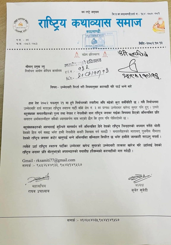 ‘खसीको मासु खान पाउँदा गाईको मासु पनि खान पाउनुपर्छ’ भन्ने सुनारको अभिव्यक्तिलाई जोडेर मंगलबार राष्ट्रिय कथाव्यास समाजले उनको उम्मेदवारी खारेज गर्न माग गर्दै उजुरी दिएको हो।