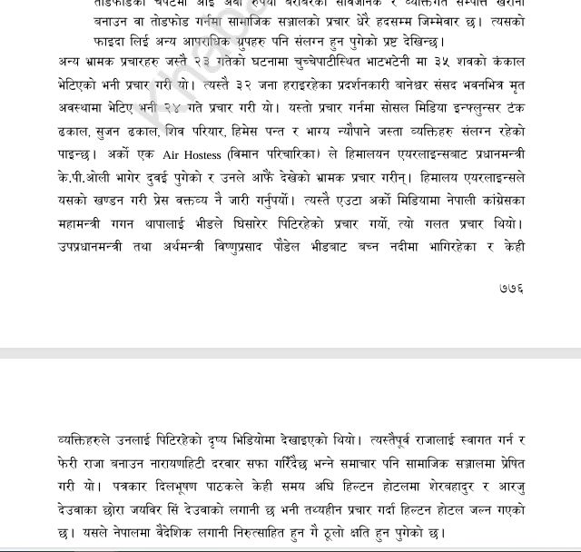 त्यस्तै पत्रकार दिलभूषण पाठकले केही समयअघि हिल्टन होटलमा शेरबहादुर र आरजु देउवाका छोरा जयविर सिंह देउवाको लगानी छ भनी तथ्यहीन प्रचार गर्दा हिल्टन होटल जल्न गएको निष्कर्ष निकालेको छ। जसको कारण नेपालमा वैदेशिक लगानी निरुत्साहित हुन गइ ठूलो क्षति हुन पुगेको आयोगले उल्लेख गरेको छ।