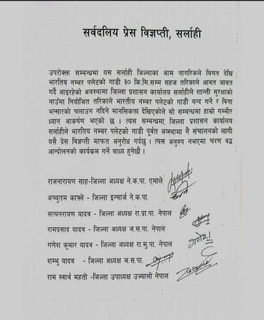 जिल्ला प्रशासन कार्यालय सर्लाहीलाई भारतीय नम्बर प्लेटको गाडी पूर्ववत् अवस्थामा नै सञ्चालनको लागि आग्रह गर्दै दलहरूले त्यस अनुरुप नभएमा चरणवद्ध आन्दोलनको कार्यक्रम गर्न बाध्य हुने चेतावनी दिएका छन्।