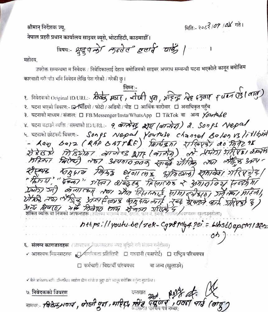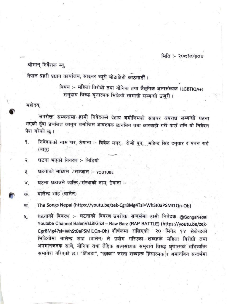 १२ वर्षअघि युट्यूवमा अपलोड भएको बालेन र लिटल ग्रिजलको र्याप ब्याटलमाथि आपत्ति जनाउँदै तेस्रोलिंगी समूदायका वन राई (बाबु दुमी), विवेक मगर, मनिन्द्र सिंह दनुवार र रोजी पुनले आज उजुरी दिएका हुन् ।