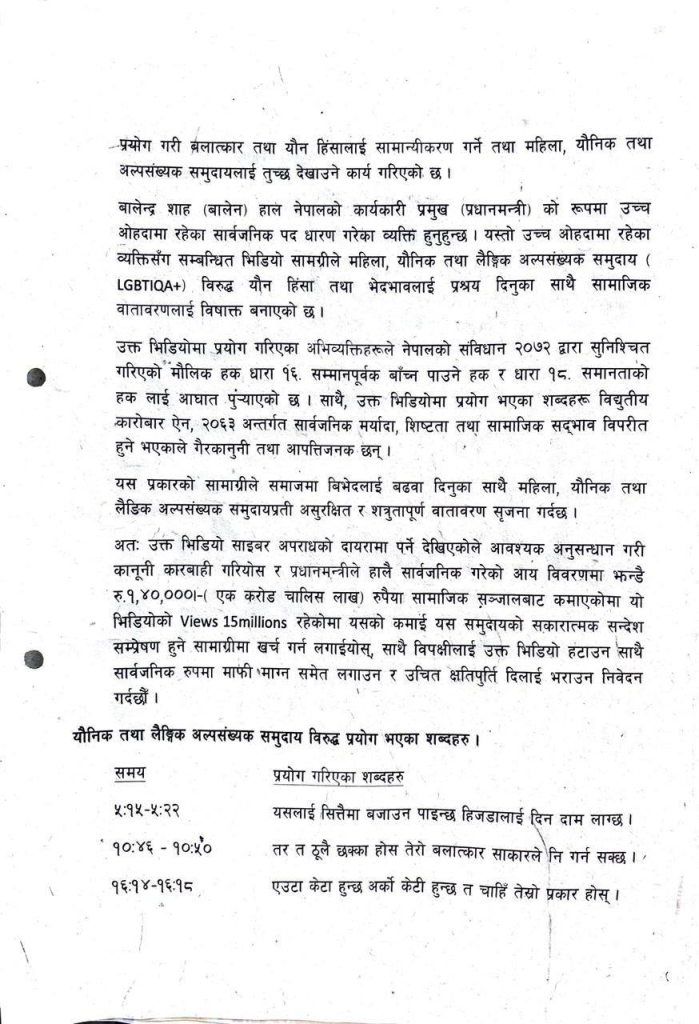 उजुरीमा भनिएको छ, ‘बालेन्द्र शाह हाल नेपालको कार्यकारी प्रमुख (प्रधानमन्त्री) को रुपमा उच्च ओहदामा रहेका सार्वजनिक पद धारण गरेका व्यक्ति हुनुहुन्छ। यस्तो उच्च ओहदामा रहेका व्यक्तिसँग सम्बन्धित भिडिओ सामग्रीले महिला, यौनिक तथा लैंगिक अल्पसंख्यक समुदायविरुद्ध यौन हिंसा र भेदभावलाई प्रश्रय दिनुका साथै सामाजिक वातावरणलाई विषाक्त बनाएको छ। यसप्रकारको सामग्रीले महिला, यौनिक तथा लैंगिक अल्पसंख्यक समुदायप्रति असुरक्षित र शत्रुतापूर्ण वातावरण सिर्जना गर्छ।’