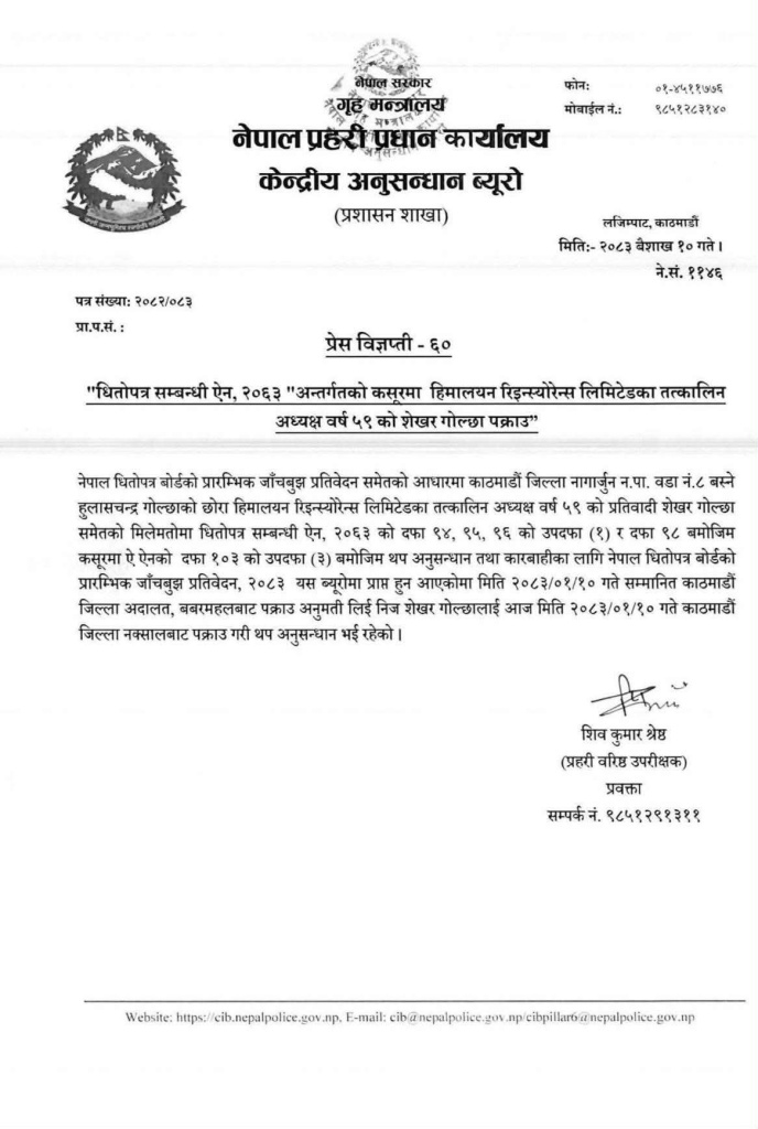 हिमालयन रि—इन्स्योरेन्समा सम्पत्ति शुद्धीकरण भएको भन्दै ०७८ असार २४ गते अख्तियार दुरुपयोग अनुसन्धान आयोगमा नेविसंघसहित तत्कालीन पाँच विद्यार्थी संगठनले उजुरी दिएका थिए। सोही प्रकरणमा अख्तियारसहित सम्पत्ति शुद्धीकरण विभाग, राजस्व अनुसन्धान विभाग र सीआईबीमा उजुरी परेको थियो।