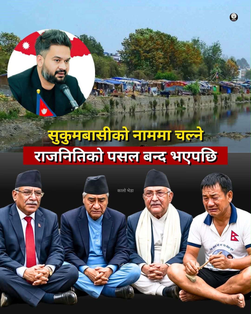 उनको पोस्टमा पुष्पकमल दाहाल, शेरबहादुर देउवा, केपी ओली र हर्क साम्पाङ रोइरहेको देखाइएको एआई सिर्जित एउटा तस्बिर पनि थियो।तस्बिरमाथि लेखिएको थियो– ‘सुकुम्वासीको नाममा चल्ने राजनीतिको पसल बन्द भएपछि।’