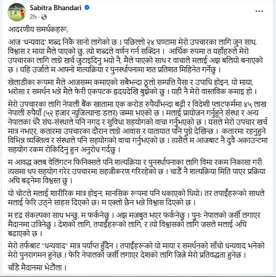 सामाजिक सञ्जाल फेसबुकमार्फत उनले आफ्नो उपचारका लागि उठेकाे रकमबारे जानकारी दिएकी हुन्।