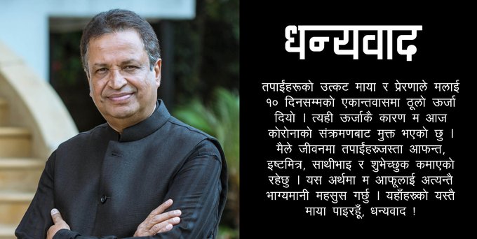 ‘तपाईंहरूको उत्कट माया र प्रेरणाले मलाई १० दिनसम्मको एकान्तवासमा ठूलो ऊर्जा दियो। त्यही ऊर्जाकै कारण म आज कोरोनाको संक्रमणबाट मुक्त भएको छु’ उनले लेखेका छन्‚ ‘मैले जीवनमा तपाईंहरूजस्ताव आफन्त‚ इष्टमित्र‚ साथिभाइ र शुभेच्छुक कमाएको रहेछु। यस अर्थमा म आफूलाई अत्यन्तै भाग्यमानी महशुस गर्छु। यहाँहरूको यस्तै माया पाइरहूँ।’