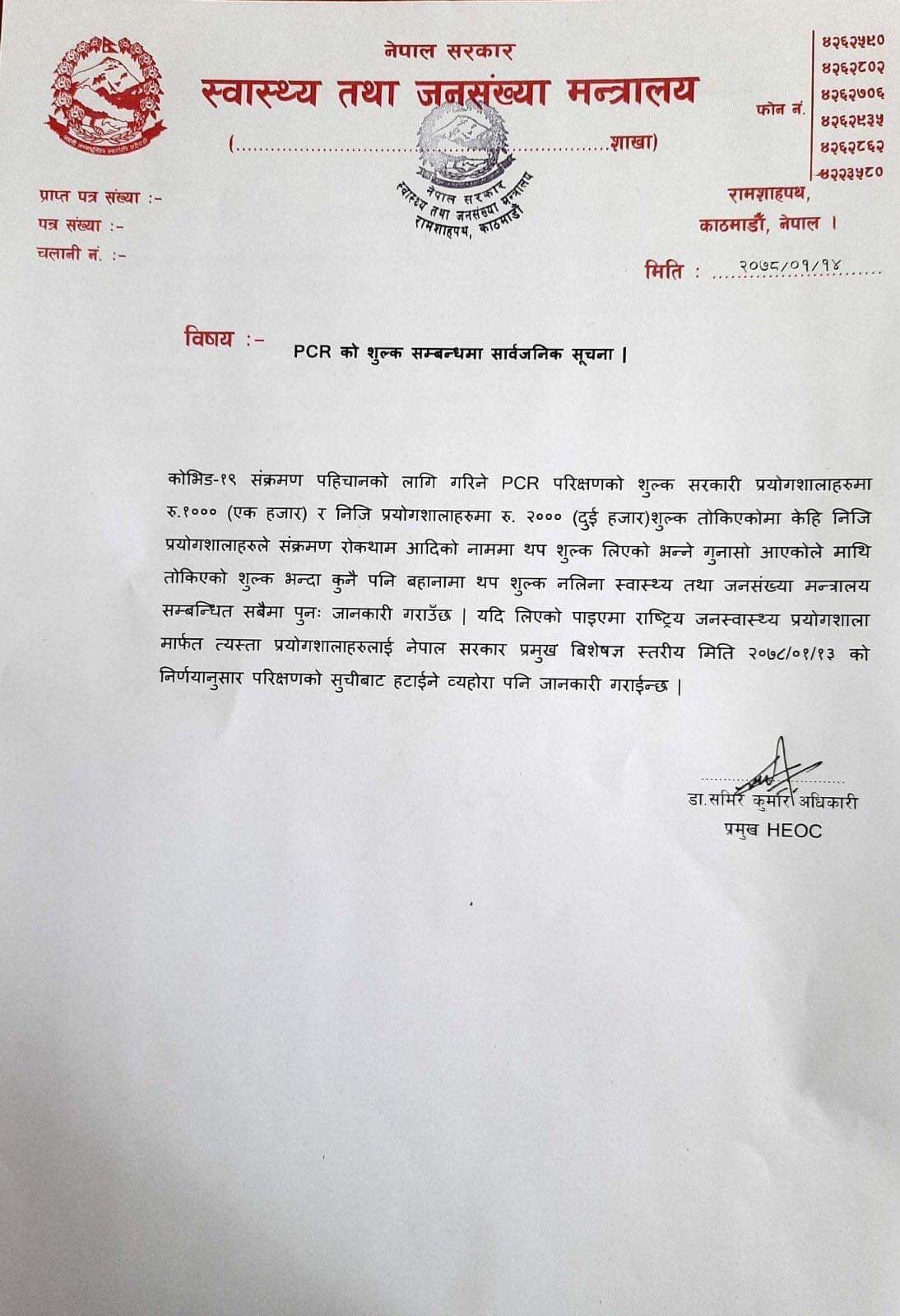 सरकारले पीसीआर परीक्षणको लागि सरकारी प्रयोगशालाहरुमा एक हजार शुल्क तोकेको छ। त्यस्तै, निजि प्रयोगशालाहरुले दुई हजार लिन पाउने व्यवस्था गरिएको छ।