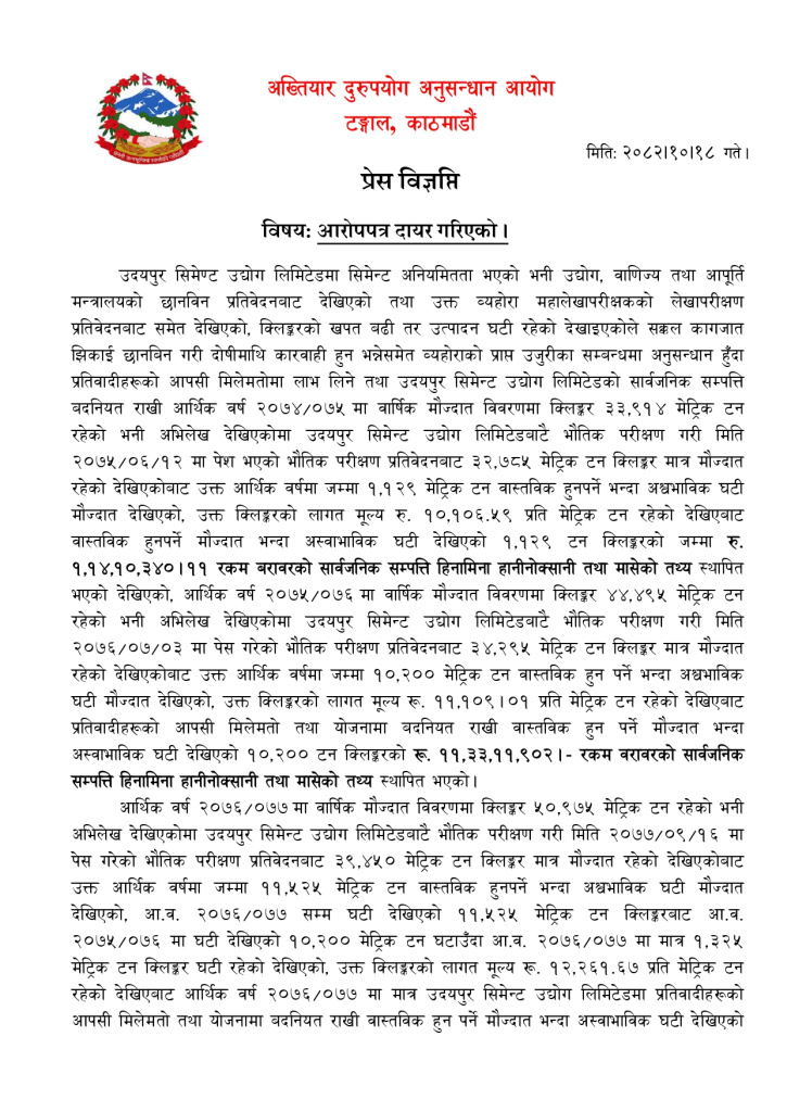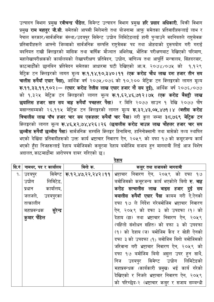 आयोगले उदयपुर सिमेन्टका तत्कालीन महाप्रबन्धक सुरेन्द्रकुमार पौडेल, नायव महाप्रबन्धक महेशप्रसाद काफ्लेलाई १२ कराेड ४७ लाख २२ हजार २ सय ४२ बिगाे माग दाबी गर्दै आइतबार विशेष अदालतमा भ्रष्टाचार मुद्धा दायर गरेकाे छ।