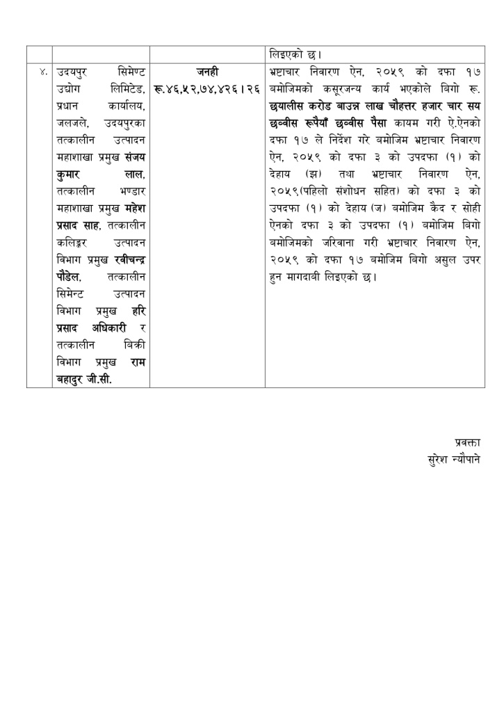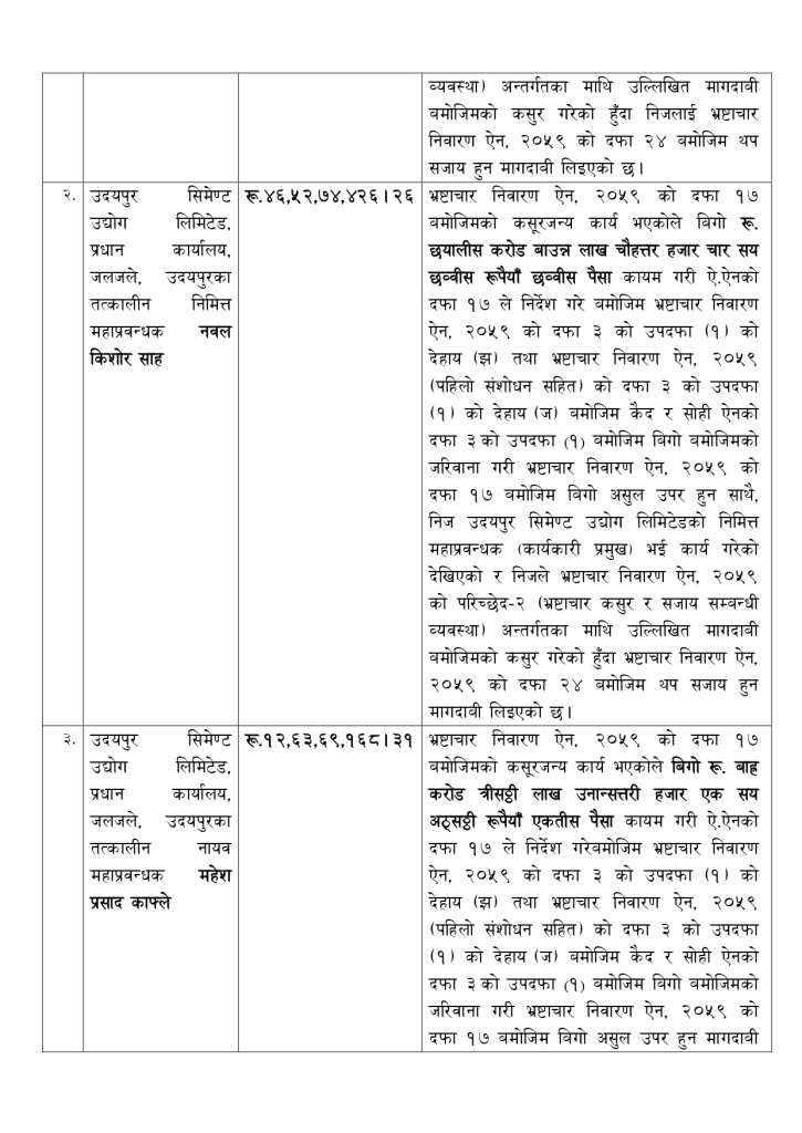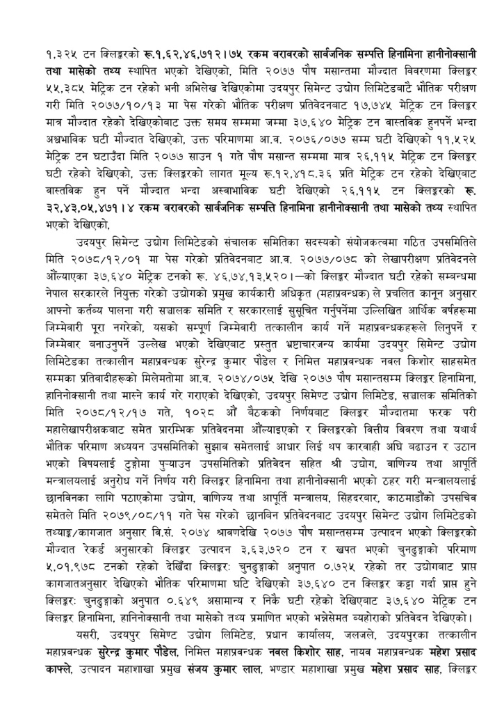 यस्तै तत्कालीन निमित्त महाप्रबन्धक नवलकिशोर साह,उत्पादन महाशाखा प्रमुख संजयकुमार लाल, भण्डार महाशाखा प्रमुख महेशप्रसाद साह, क्लिङ्कर उत्पादन विभाग प्रमुख रविचन्द्र पौडेल, सिमेन्ट उत्पादन विभाग प्रमुख हरिप्रसाद अधिकारी, बिक्री विभाग प्रमुख रामबहादुर जीसीलाई जनही ४६ करोड ५२ लाख ७४ हजार ४ सय २६ बिगो दाबी गरेको छ।