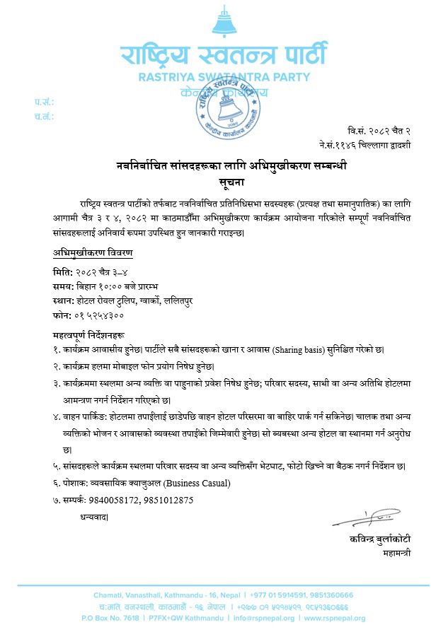राष्ट्रिय स्वतन्त्र पार्टी (रास्वपा) ले आफ्ना नवनिर्वाचित प्रतिनिधि सभा सदस्यहरूका लागि दुई दिने विशेष अभिमुखीकरण कार्यक्रम आयोजना गर्ने भएको छ।
