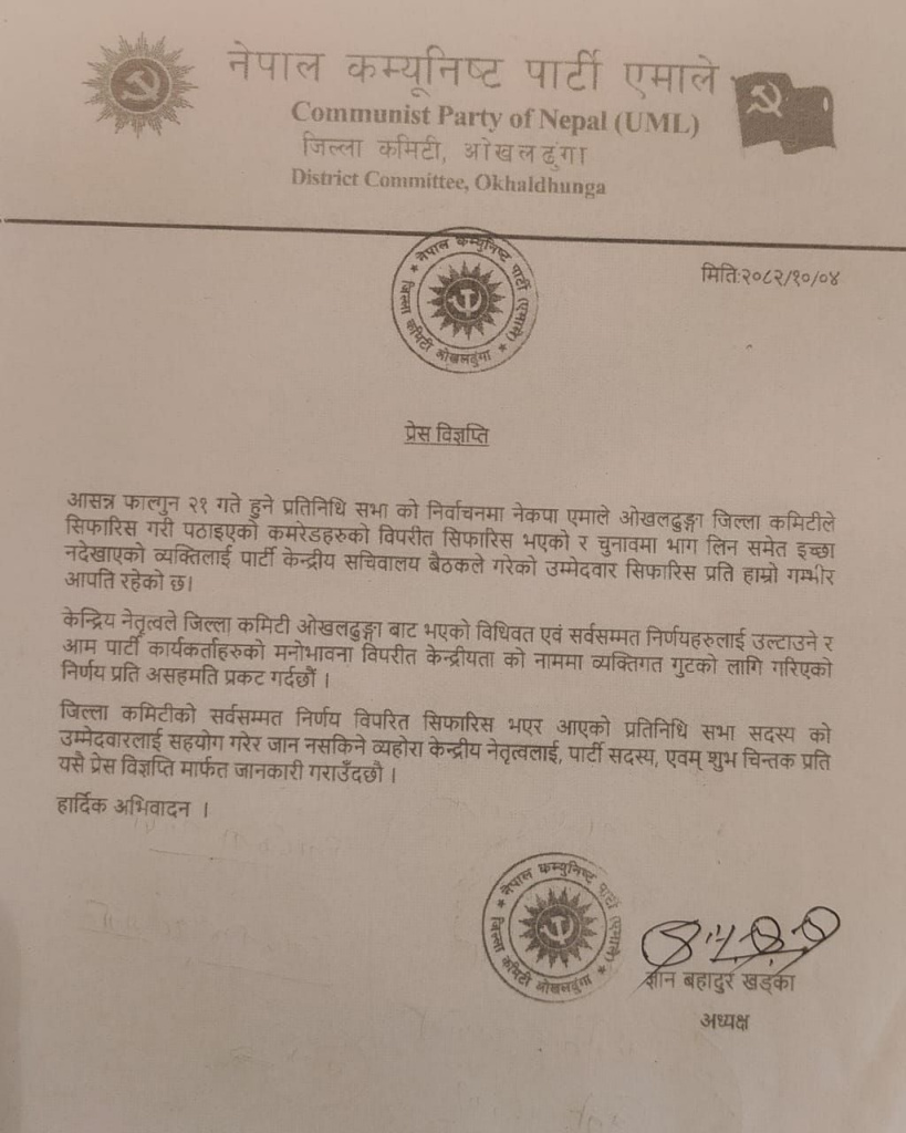 उनले विज्ञप्ति नै जारी गर्दै पार्टी केन्द्रीयताको नाममा व्यक्तिगत गुटको लागि गरिएको निर्णयप्रति असहमति प्रकट गर्दै जिल्ला कमिटीको निर्णयविपरित सिफारिस भएकी थापालाई सहयोग गरेर जान नसकिने चेतावनी दिएका छन्।