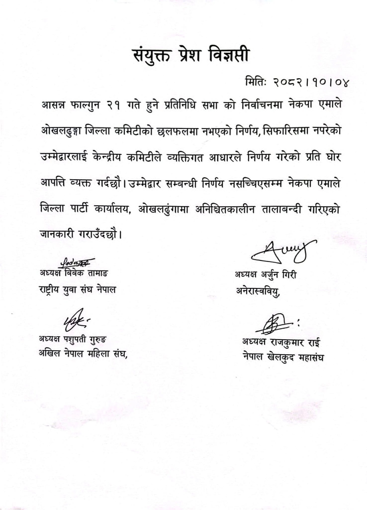 यता एमालेनिकट भातृसंगठनहरू युवासंघ नेपाल, अनेरास्ववियु, अनेमसंघ र नेपाल खेलकुद महासंघले उम्मेदवारसम्बन्धी निर्णय नसच्याएसम्म जिल्ला पार्टी कार्यालयमा अनिश्चितकालिन तालाबन्दी गरेका छन्।