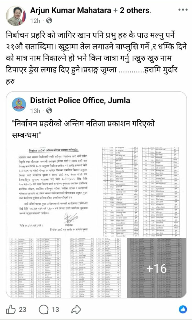 जुम्लामा निर्वाचन सुरक्षाका लागि खटाइने अस्थायी प्रहरी (निर्वाचन प्रहरी) भर्ना प्रक्रियालाई लिएर विवाद उत्पन्न भएको छ।