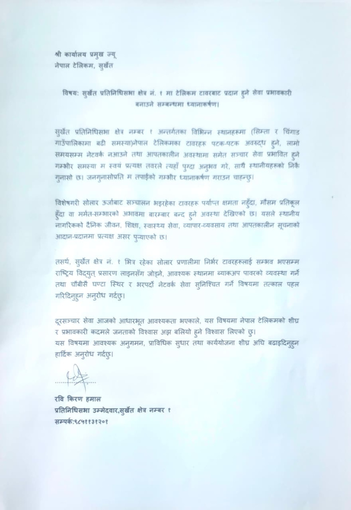 सुर्खेत प्रतिनिधिसभा क्षेत्र नं १ का उम्मेदवार रवि किरण हमालले चुनावी अभियानका क्रममा देखिएका सञ्चारसम्बन्धी समस्याप्रति नेपाल टेलिकमको ध्यानाकर्षण गराएका छन्।