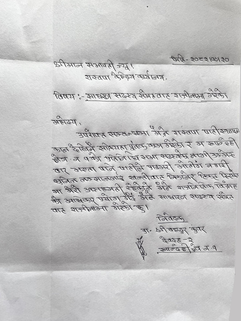 उनले रास्वपाले समानुपातिकमा नाम राखिदिने भनेर ५० हजार र प्रत्यक्षमा २५ हजार रकम लिएर भ्रष्टाचारको नयाँ तरिका अपनाएको आरोप लगाउँदै पार्टी परित्याग गरेका हुन्।
