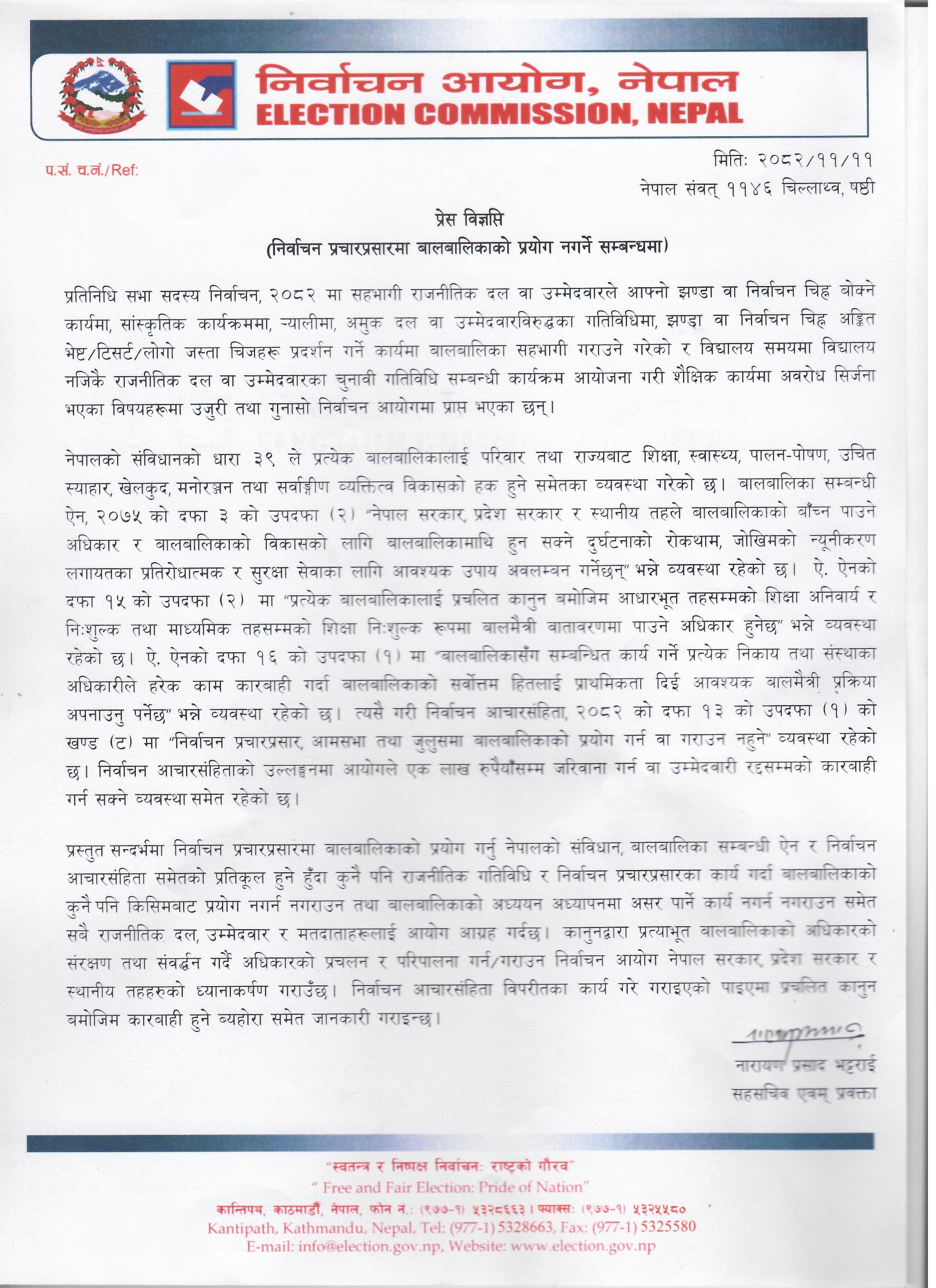 उजुरीहरू बढेपछि आयोगले विज्ञप्ति जारी गर्दै निर्वाचन प्रचारमा बालबालिकाको प्रयोग नगर्न सबै राजनीतिक दल, उम्मेदवार र मतदातालाई सचेत गराएको छ।