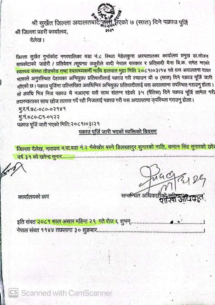 यस्तै सुनारविरुद्ध २१ असार ०८१ मा सुर्खेत जिल्ला अदालतले पनि पक्राउ पूर्जी जारी गरेको भेटिएको छ। अस्पताल तोडफोड र स्वास्थ्यकर्मीमाथि हातपात मुद्धामा उनीविरुद्ध पक्राउ पूर्जी जारी भएको देखिन्छ। तर, उक्त मुद्धामा पनि उनी पक्राउ नपरेको र सजाय भुक्तान गर्न बाँकी रहेको प्रहरी प्रधान कार्यालयले जनाएको छ।