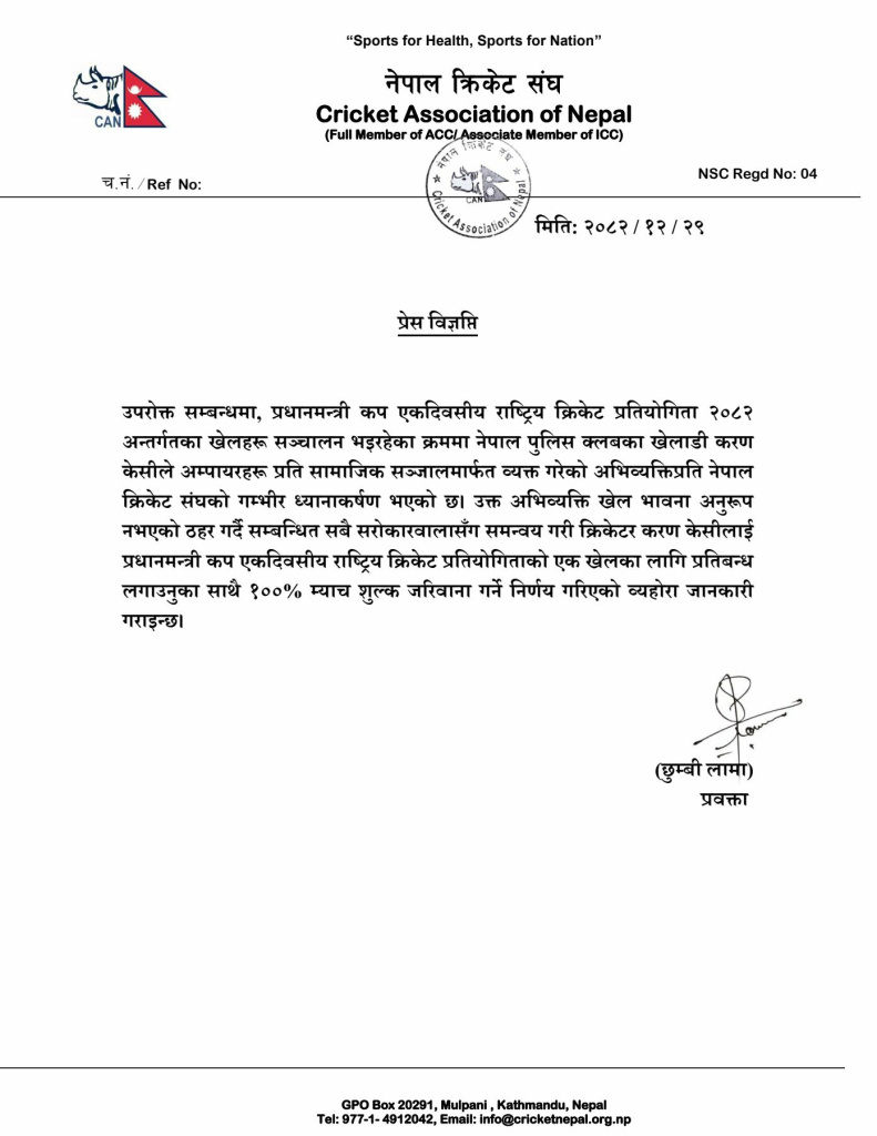क्यानले करणलाई पीएम कप पीएम कप क्रिकेट प्रतियोगिताको एक खेलका लागि प्रतिबन्ध लगाउनुका साथै १०० प्रतिशत म्याच शुल्क जरिवाना गर्ने निर्णय गरेको प्रवक्ता छुम्बी लामाले बताए।